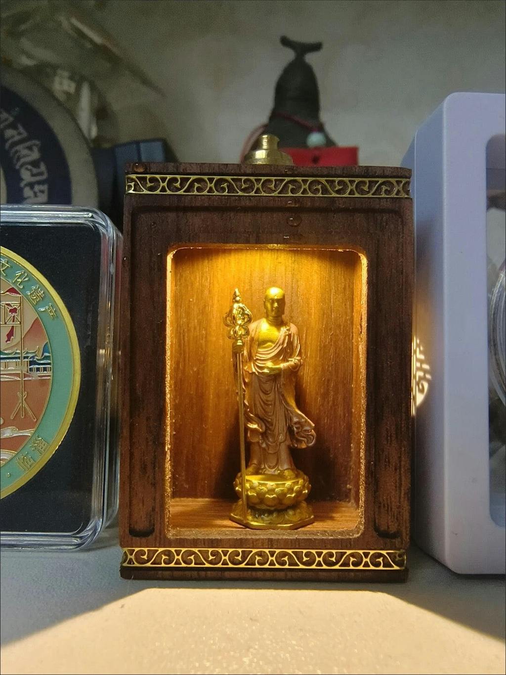 Walnut Travel Shrine with Light – Painted Copper Ksitigarbha